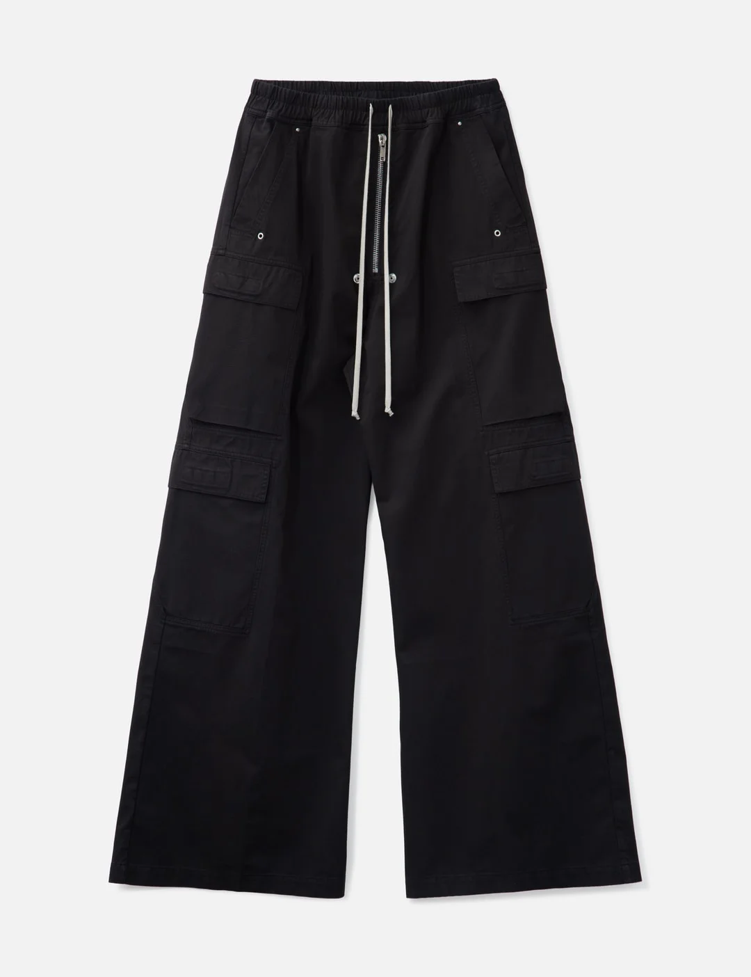 - Rick Owens Drkshdw - Double Cargo Jumbo Belas - Made of mediumweight cotton twill - Full-length - Low crotch - Wide leg - Elastic waistband with drawstring - Bela exposed center zipper with two snap buttons - Side welt pockets with rivets - Two beveled cargo pockets on the thigh - Two square cargo pockets below - Two square back pockets - Made in Italy - Color: Black - Material: 100% Cotton - See more Pants and Clothing - Model wears size M - Model measures: Height 190cm, Chest 32”/84cm, Waist 32”/81cm, Hip 34”/86cm - Vendor Code: DU02E7398-TW