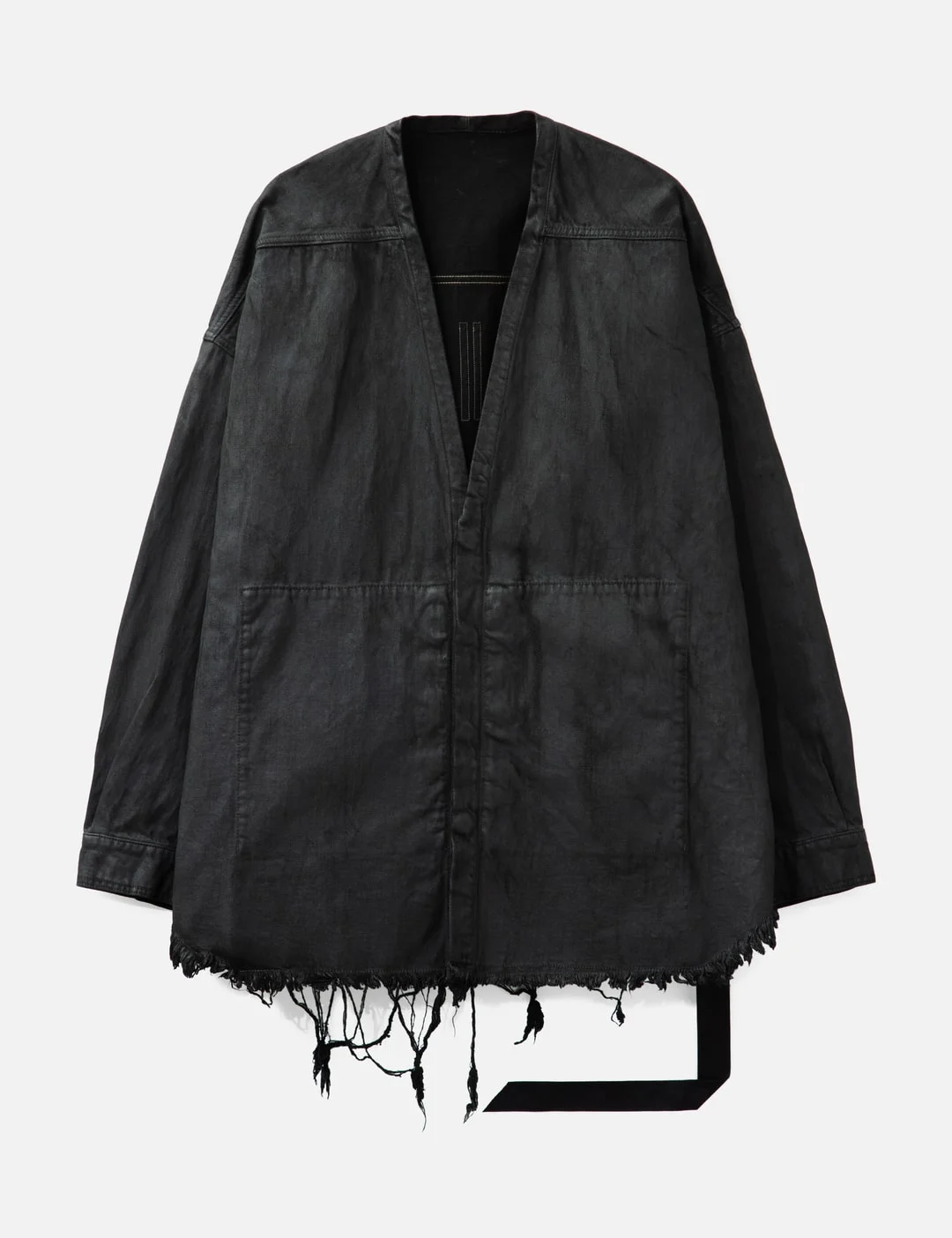 - Rick Owens Drkshdw - Lido Larry Shirt - Made of 13oz Japanese black and natural denim - Overdyed black and treated with a wax finish - Mid thigh-length - Long sleeves - Deep V-neck - Centre front opening with concealed snap closures - Level shoulder seams back yoke - Cuffs with concealed snaps - Signature cotton webbing strap on back - Raw-cut hem - Made in Italy - Color: Black Wax - Material: 100% Cotton - See more Denim Jackets, Jackets and Clothing - Model wears size M - Model measures: Height 190cm, Chest 32”/84cm, Waist 32”/81cm, Hip 34”/86cm - Vendor Code: DU02E7756-BW