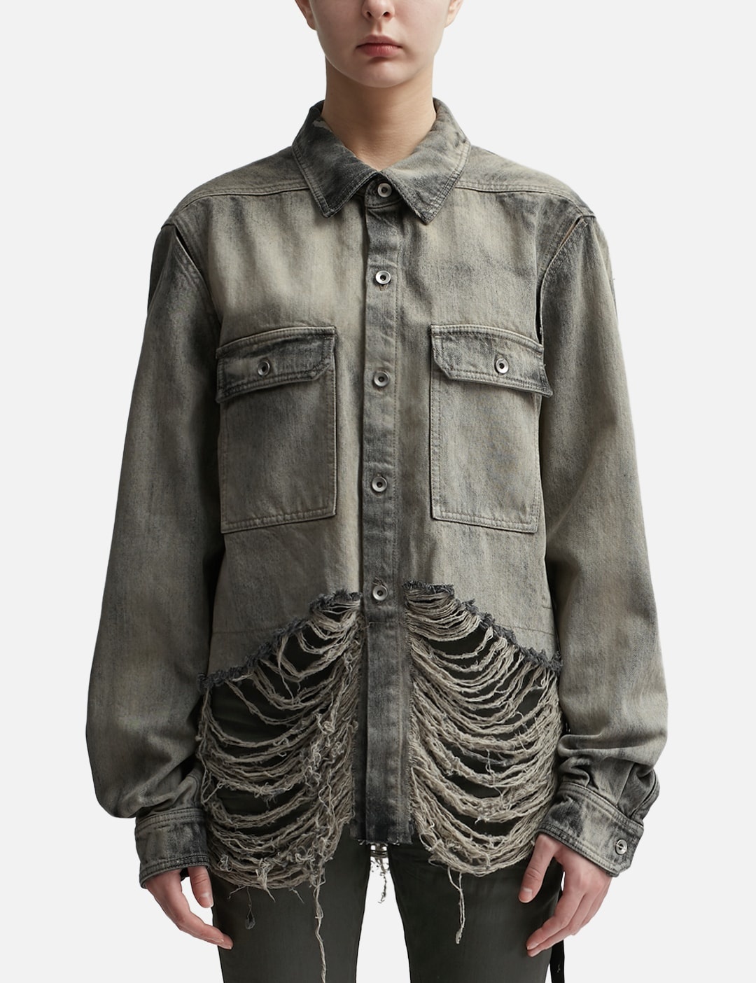 - Rick Owens Drkshdw - Luxor Cape Sleeve Cropped Outershirt - 13oz black Japanese selvedge denim with a mineral pearl finish - Stonewashed and overdyed with natural mineral color - Waist length - Straight fit - Center front placket with metal buttons - Classic collar - Square chest pockets with beveled corner flaps and buttons - Cape sleeves - Nylon-lined sleeves - Long sleeves with buttoned cuffs - Signature-level shoulder seams - Distressed details around the lower hem - Made with GOTS certified organic cotton - Color: Mineral Fringed - Material: 100% Cotton - See more Denim Jackets, Jackets and Clothing SIZING - Model wears size M - Model measures: Height 173cm, Chest 32”/81cm, Waist 23’’/58.42cm, Hip 34”/86.4cm