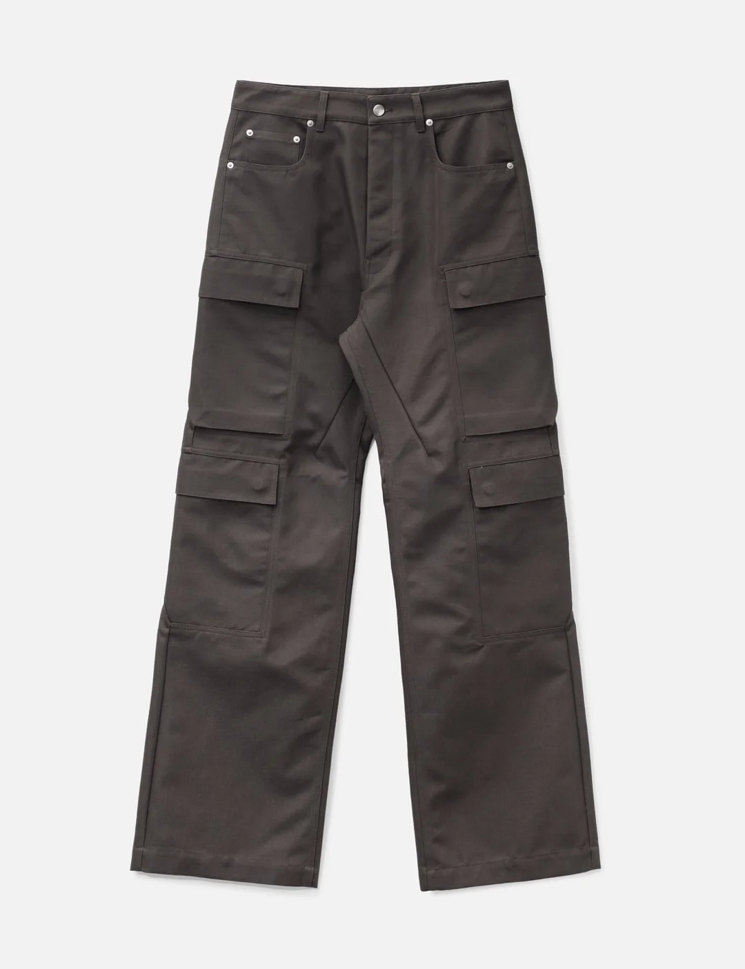 - Rick Owens - Geth Cargo Pants - Loose fit - Silver button fly - Two front pockets with a coin pocket - Four beveled cargo pockets on the sides with snap - Two back pockets - Made in Italy - Color: 78 Dark Dust - Material: 62% Cotton, 38% Polyamide - See more Pants and Clothing - Model wears size 30 - Model measures: Height 186cm, Chest 34”/86cm, Waist 28”/71cm, Hip 36”/91cm - Vendor Code: RU01F2340-CDU
