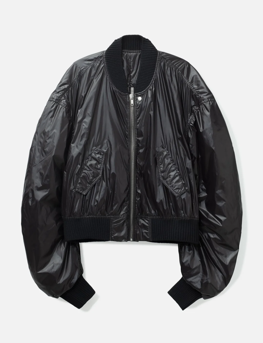 - Rick Owens - Secchia Flight Jacket - Oversized fit - Slightly cropped - Made of airy and lightweight nylon - Ribbed crewneck, cuffs and hem - Front zipper closure - Long, gathered sleeves - Front snap pockets with flaps - Fully lined - Two internal zippered pockets - Color: 09 Black - Material: 100% Nylon; Rib: 92% New Wool. 6% Nylon, 2% Elastane; Padding 100% Polyester - See more Jackets and Clothing - Model wears size 48 - Model measures: Height 186cm, Chest 34”/86cm, Waist 28”/71cm, Hip 36”/91cm - Vendor Code: RU01F2792-NPS
