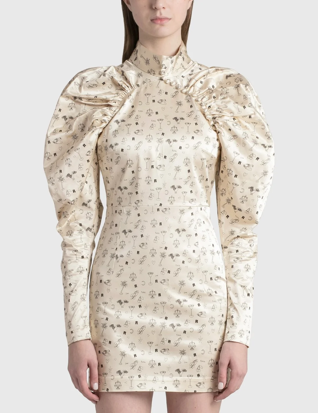 - Rotate Birger Christensen - Kim Dress - Sheer viscose exterior - Allover R motif patterns - High neck - Puffy, statement sleeves - Button details on shoulder line and cuffs - Rear concealed zip closure - Mini Length - Color: White Sand Comb - Material: 96% Viscose, 4% Elastane - See more Dresses and Clothing SIZING - Model wears size 32 - Model measures: Height 181cm, Chest 33”/84cm, Waist 24”/61cm, Hip 35”/90cm