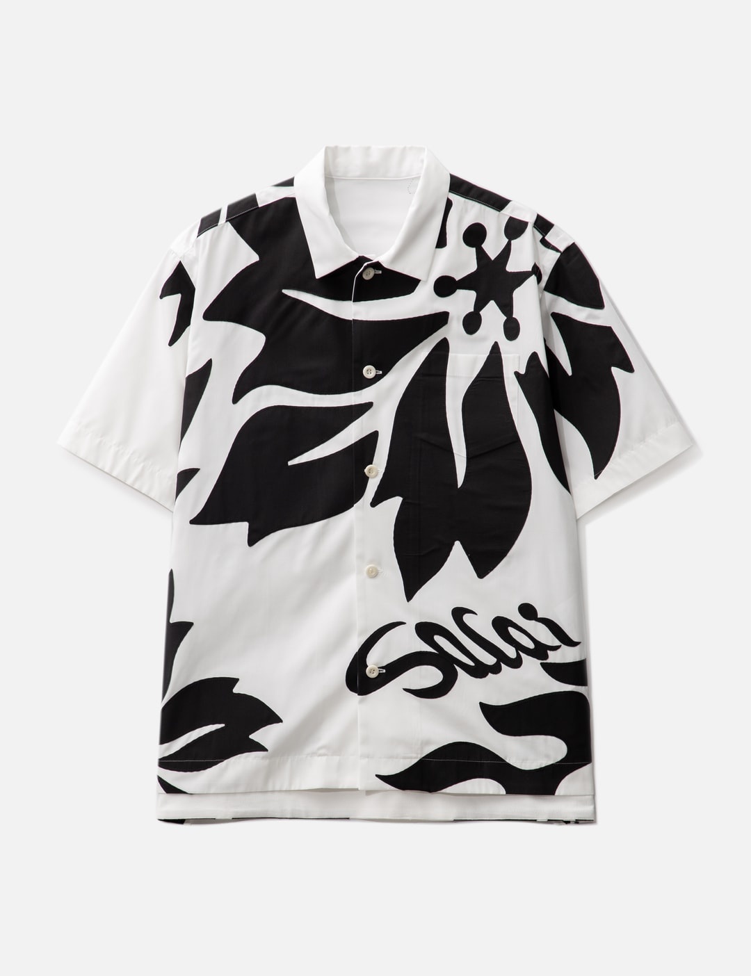 - Sacai - Floral Embroidered Patch Poplin Shirt - Polyester-cotton blend poplin fabric - Embroidered floral patches for an overal textured finish - Camp collar - Fake chest pocket - Straight hem - Color: Off-White/Black - Material: 70% Polyester, 30% Wool - See more Shirts and Clothing SIZING - Model wears size 2 - Model measures: Height 189cm, Chest 32”/81cm, Waist 27”/69cm, Hip 35.5”/90cm
