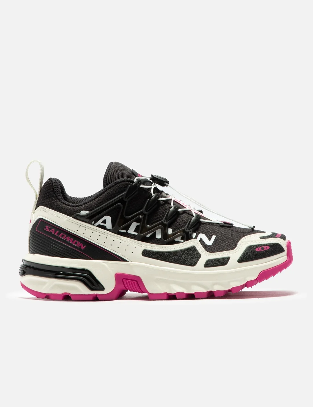 - Salomon Advanced - ACS + Heritage Pack - Synthetic and textile upper - Agile Chassis System - Quicklace ® closure - Oversised logo on quarter - Protective toecap - OrthoLite® sockliner - Rubber Contagrip ® outsole - Color: Black / Vanilla Ice / Pink Glo - Material: Synthetic, Textile, Rubber - See more Sneakers and Shoes - Vendor Code: L47436500