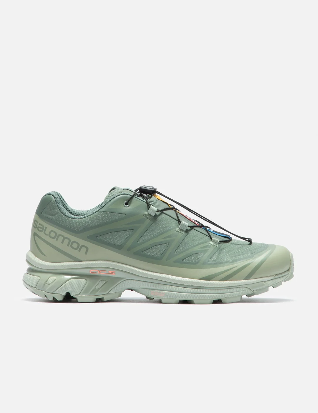 - Salomon Advanced - XT-6 GORE-TEX - Synthetic and textile upper - PFC-free GORE-TEX ePE membrane - Anti-debris mesh construction - Abrasion-resistant - SensiFit™ - Quicklace ® closure - Protective toecap - Molded OrthoLite® sockliner - Rubber mud Contagrip ® outsole - Colors: Desert Sage/ Lily Pad/ Laurel Wreath - Material: Synthetic, Textile, Rubber - See more Sneakers and Shoes - Vendor Code: L47292000