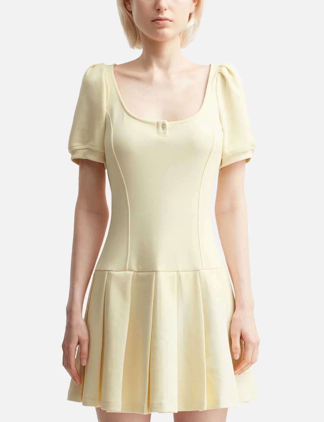 - Sandy Liang - Camden Dress - Made in pique cotton - Mini polo dress - Low-cut U-collar - Short-sleeved - Front mother of pearl button - Slightly dropped waist - Pleated skirt - Color: Butter - Material: Cotton, Polyester - See more Dresses and Clothing - Model wears size S - Model measures: Height 177cm, Chest 31.9’’/81cm, Waist 23.6’’/60cm, Hip 35.8’’/91cm - Vendor Code: H25D097-F137