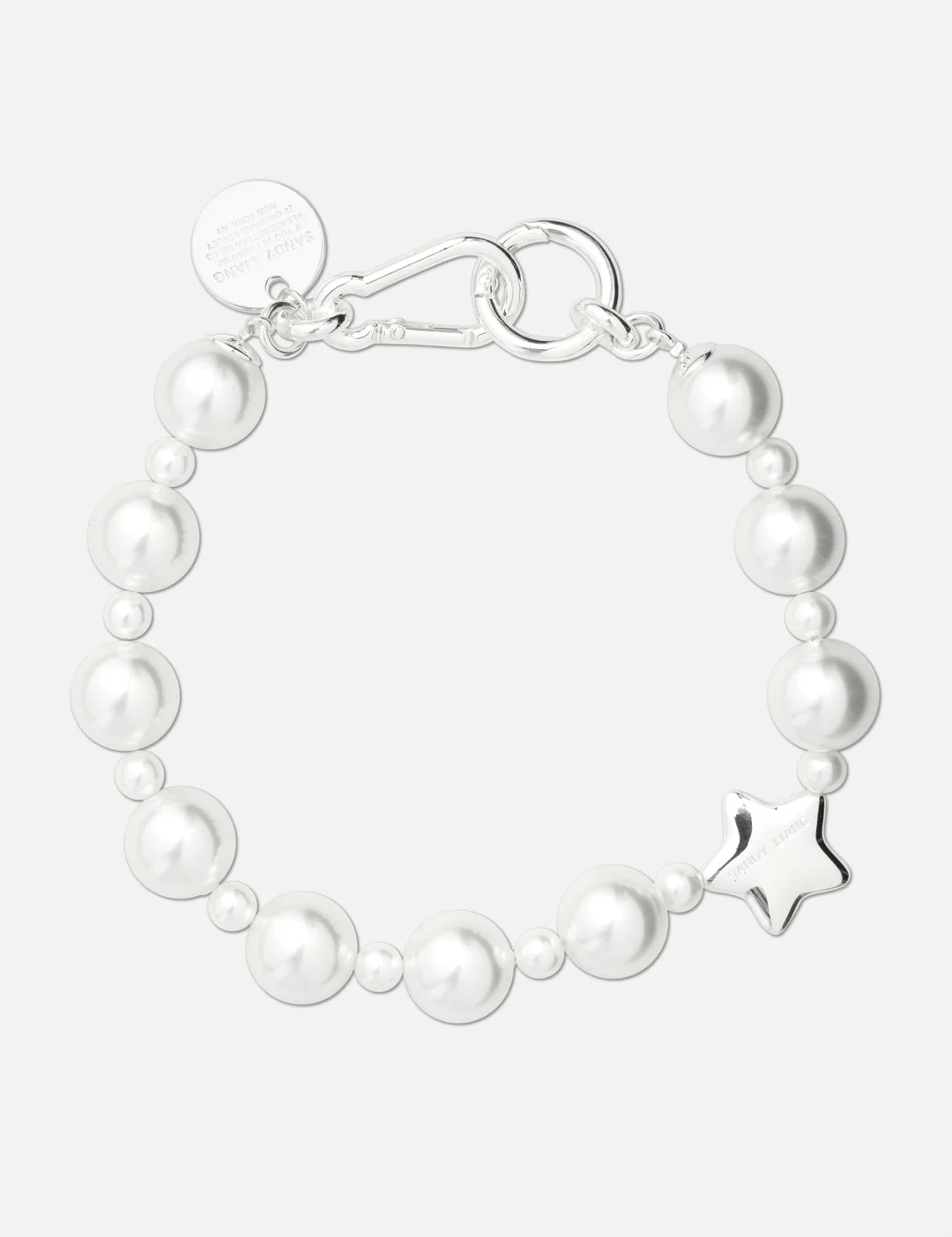 - Sandy Liang - Pearl Key Charm - Made of rhodium-plated brass - Imitation pearls in two sizes - Puffy star-shaped charm - Carabiner clasp - 'If Found' tag - Color: Pearl - Material: Brass - See more Keychains, Jewelry and Accessories - Max. Length: 36cm - Vendor Code: F25A034-C003
