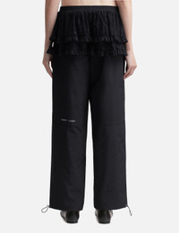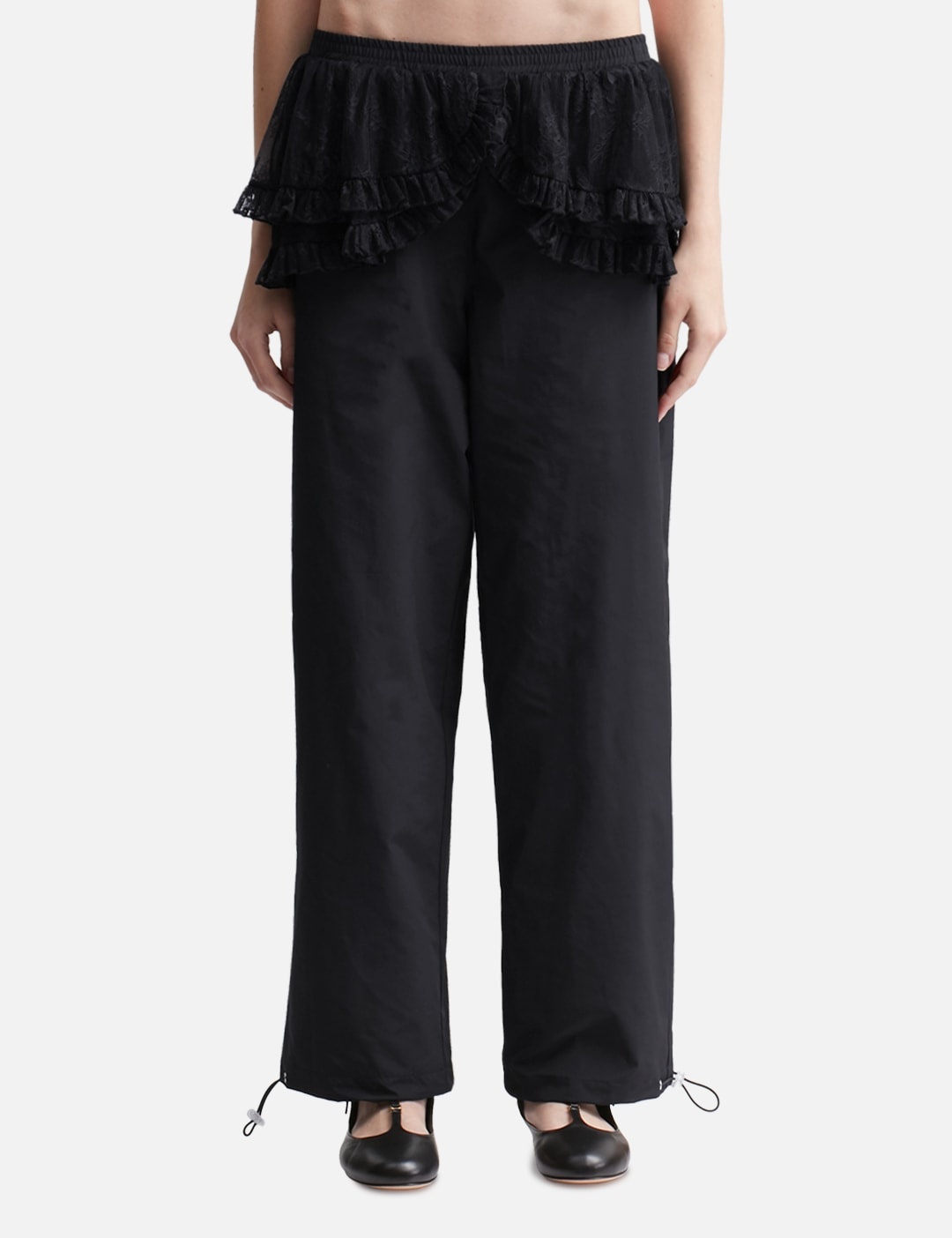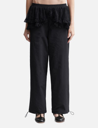 - Sandy Liang - Rodez Pants - Lightweight track pants featuring lace peplum details around waist - Elasticated waistband - Two side pockets - Reflective branding at rear leg - Fully lined in mesh - Adjustable hem - Color: Black - Material: 100% Polyester - See more Pants and Clothing SIZING - Model wears size S - Model measures: Height 177cm, Chest 32”/81cm, Waist 23.5”/59.7cm, Hip 33’’/83.8cm