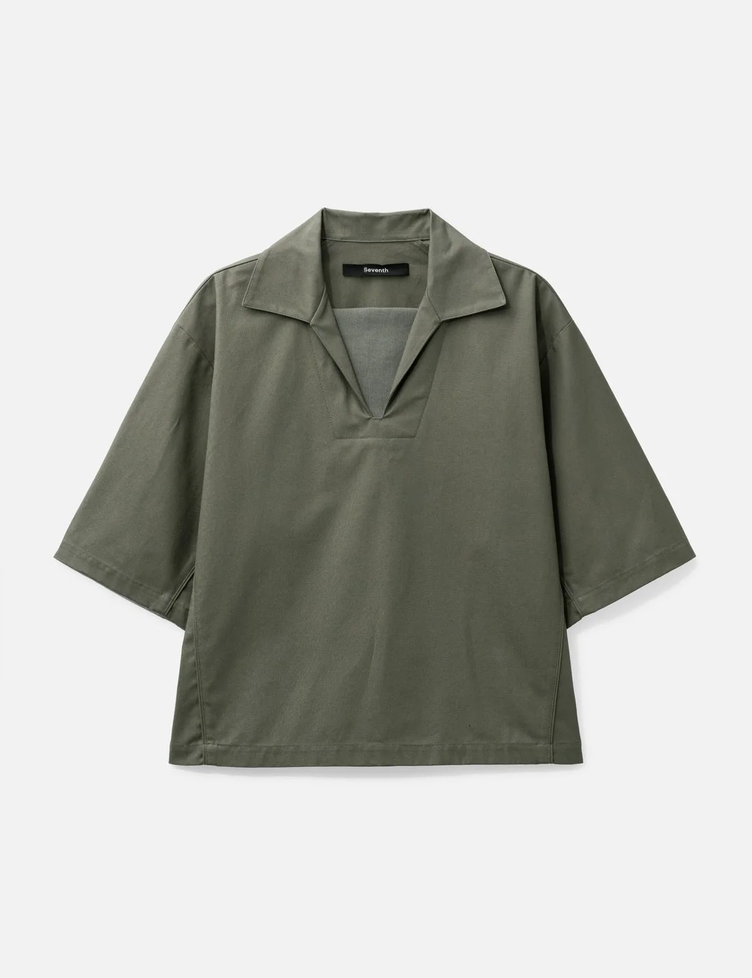 - Seventh - Football Box Polo - Boxy silhouette - Sailor’s shirt-like collar - Ribbed collar - Short, wide sleeves - Made in Korea - Color: Sage - Material: 100% Cotton - See more Shirts and Clothing - Vendor Code: T250204 - Model wears size S - Model measures: Height 179cm, Chest 31’’/79cm, Waist 24’’/61cm, Hip 36.4’’/92.5cm