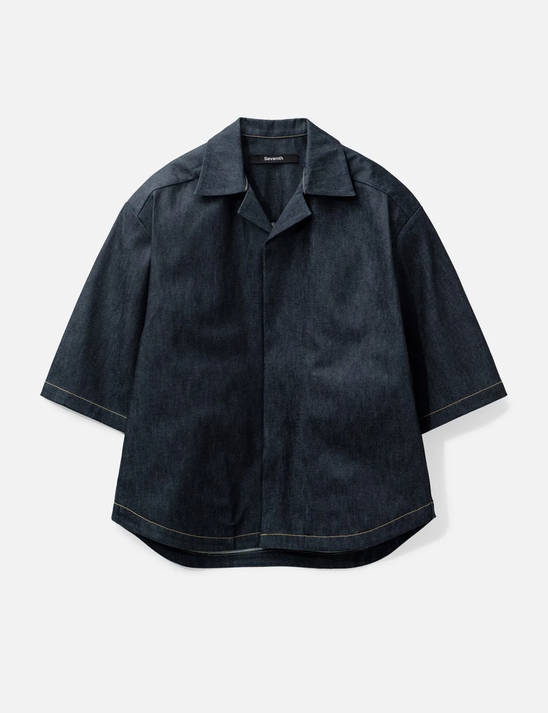 - Seventh - M5 Cuban Shirt - Made from rigid denim - Boxy silhouette - Open collar - Short sleeves - Magnetic buttons - Side pockets - Made in Korea - Color: Raw Indigo - Material: 100% Cotton - See more Shirts and Clothing - Vendor Code: T250203 - Model wears size S - Model measures: Height 179cm, Chest 31’’/79cm, Waist 24’’/61cm, Hip 36.4’’/92.5cm