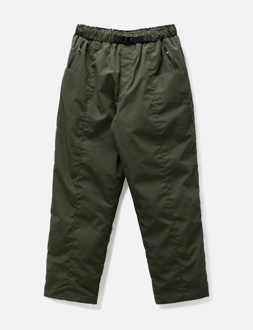 - South2 West8 - South2 West8 x Nanga Belted C.S. Down Pants - South2 West8 x Nanga collaborative collection - Spanish white duck down - Elasticated waistband with integrated buckle belt - Four front pockets - Fully lined in nylon - Color: A-Olive - Material: 93% Polyester, 7% Aramid; Filling: 90% Duck Down, 10% Feather - See more Pants and Clothing SIZING - Model wears size S - Model measures: Height 187cm, Chest 37”/96.5cm, Waist 30”/76.2cm, Hip 37”/94cm