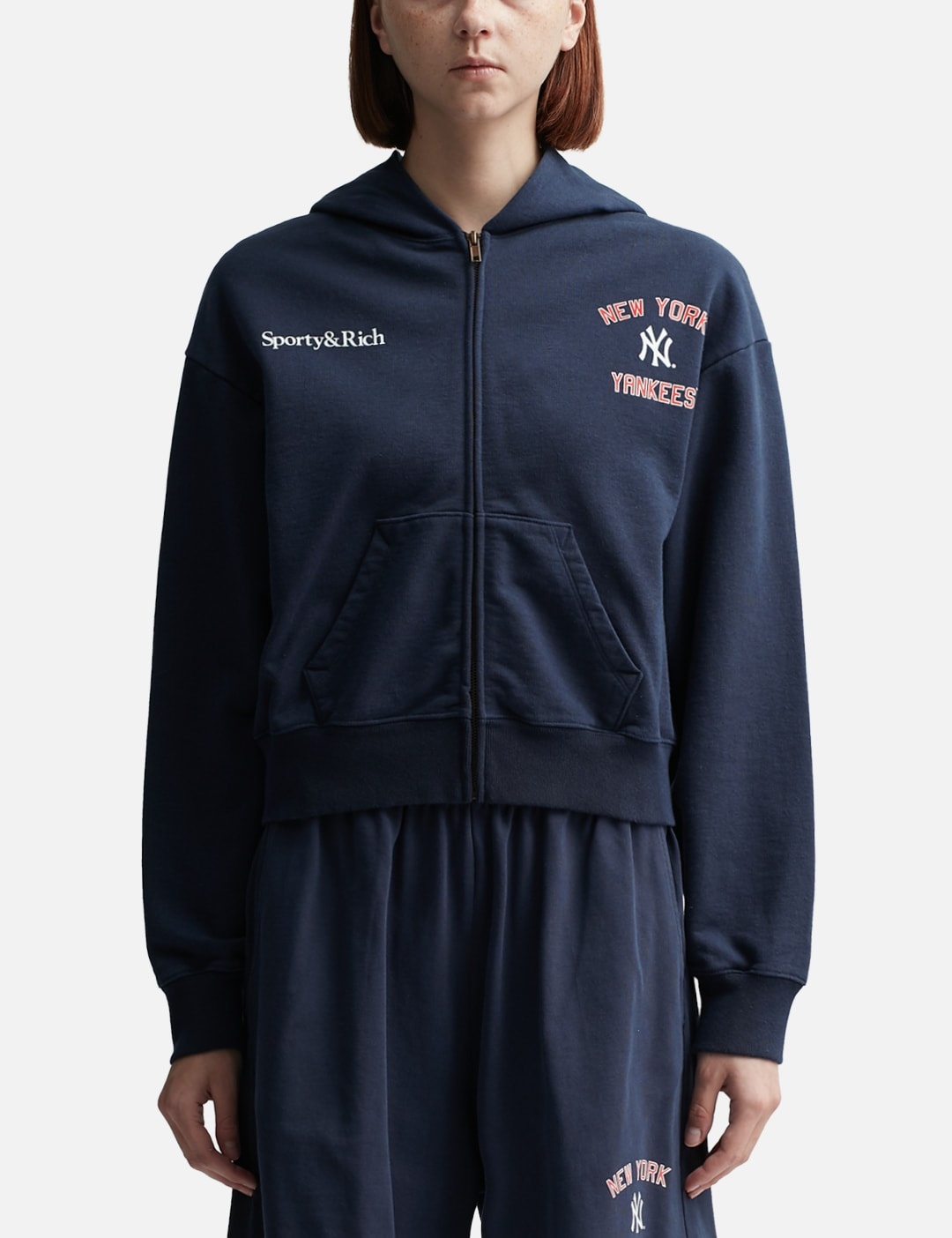 - Sporty & Rich - Home Run Cropped Zip Hoodie - Sporty & Rich x NY Yankees collaborative collection - Heavyweight cotton fabric - Zip closure - Graphic logo print at front - Two front pockets - Ribbed cuffs and hem - Brushed lining - Color: Navy Sports Red/White - Material: 100% Cotton - See more Hoodies and Clothing SIZING Male - Model wears size L - Model measures: Height 183cm, Chest 35.5"/90cm, Waist 30"/76cm, Hip 33"/84cm - Model wears size S - Model measures: Height 177cm, Chest 32”/81cm, Waist 23.5”/59.7cm, Hip 33’’/83.8cm