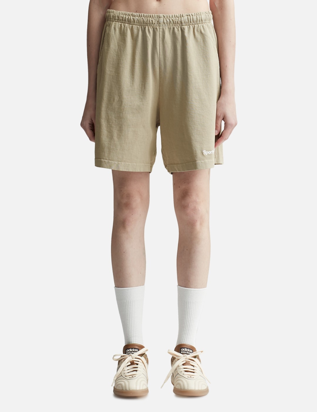 - Sporty & Rich - Serif Logo Embroidered Gym Shorts Elephant/White - Mid-length - Shrink free - Garment dyed - Elastic waistband with drawstring - Front pockets and back pocket - Made in USA - Color: Elephant/White - Material: 100% Cotton - See more Shorts and Clothing SIZING - Model wears size M - Model measures: Height 177cm, Chest 32”/81cm, Waist 23.5”/59.7cm, Hip 33’’/83.8cm