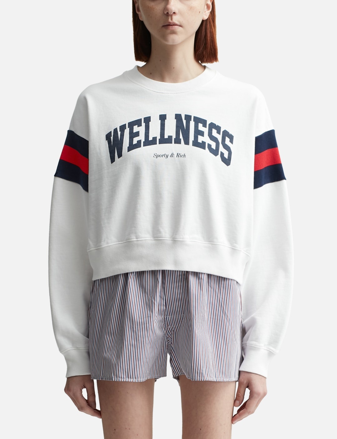 - Sporty & Rich - Wellness Ivy Rugby Crewneck - Made of 11.5 oz cotton - Crewneck - Pre-shrunk - Slightly oversized - Garment Dyed - Cropped length - Printed stripes around the arms - Made in Portugal - Color: White/ Bright Red/ Navy - Material: 100% Cotton - See more Sweatshirts and Clothing SIZING Men - Model wears size L - Model measures: Height 188cm, Chest 36"/92cm, Waist 30"/76cm, Hip 37"/94cm - Model wears size S - Model measures: Height 177cm, Chest 32"/81cm, Waist 23.5"/59.7cm, Hip 33’’/83.8cm