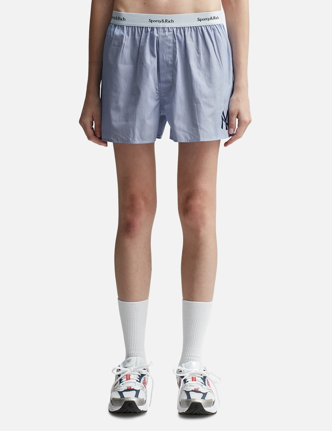 - Sporty & Rich - Yankees Serif Boxer - Elasticated waistband - Button fly - Embroidered logo - Rear patch pocket - Color: White/Light Blue Stripe - Material: 100% Cotton - See more Shorts and Clothing SIZING - Model wears size S - Model measures: Height 177cm, Chest 32”/81cm, Waist 23.5”/59.7cm, Hip 33’’/83.8cm