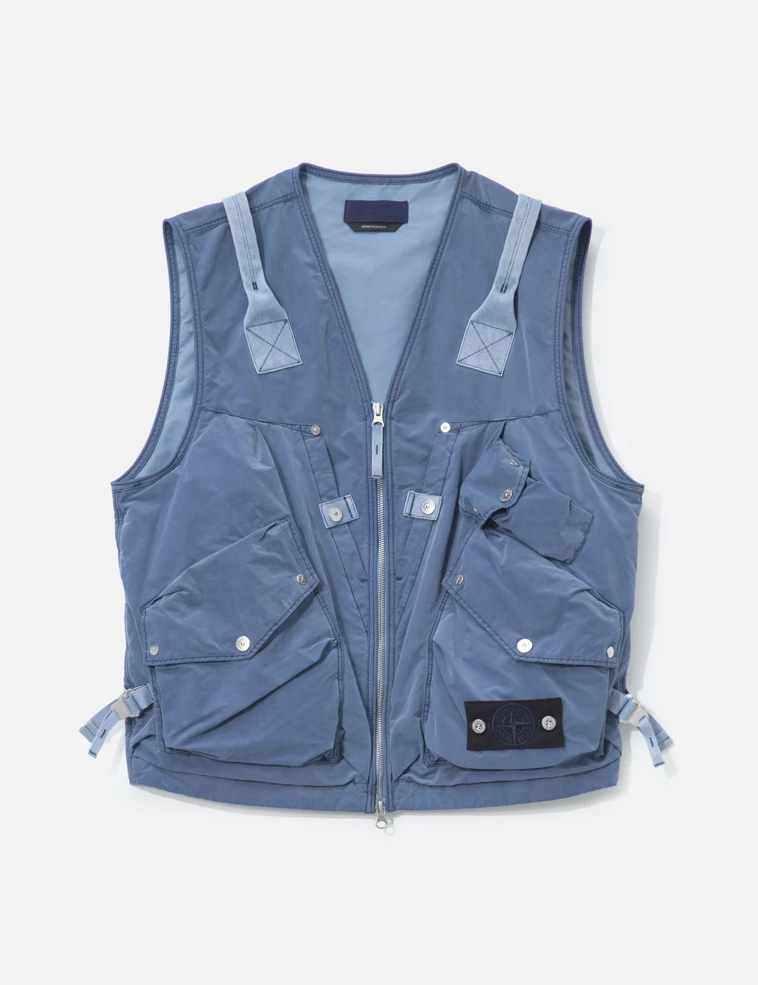 - Stone Island - Garment Dyed Nylon Vest - Made of polyester, polyamide and nylon - Garment dyed with anti-drop agent - V neck - Two way zipper closure - Thick nylon tape handle on shoulders - V shape diagonal slant pockets with snap at chest - Two flap pockets with snaps - Stone Island Denim Research badge with metal buttons at left pocket - Adjustable nylon tape strap at side seam - All-over contrast stitching - Made in Italy - Color: V0021 - Indigo - Material: 68% Polyester, 32% Polyamide/Nylon; Lining: 100% Polyester - See more Vests and Clothing - Model wears size M - Model measures: Height 186cm, Chest 34”/86cm, Waist 28”/71cm, Hip 36”/91cm - Vendor Code: S15 G100016 S0J14