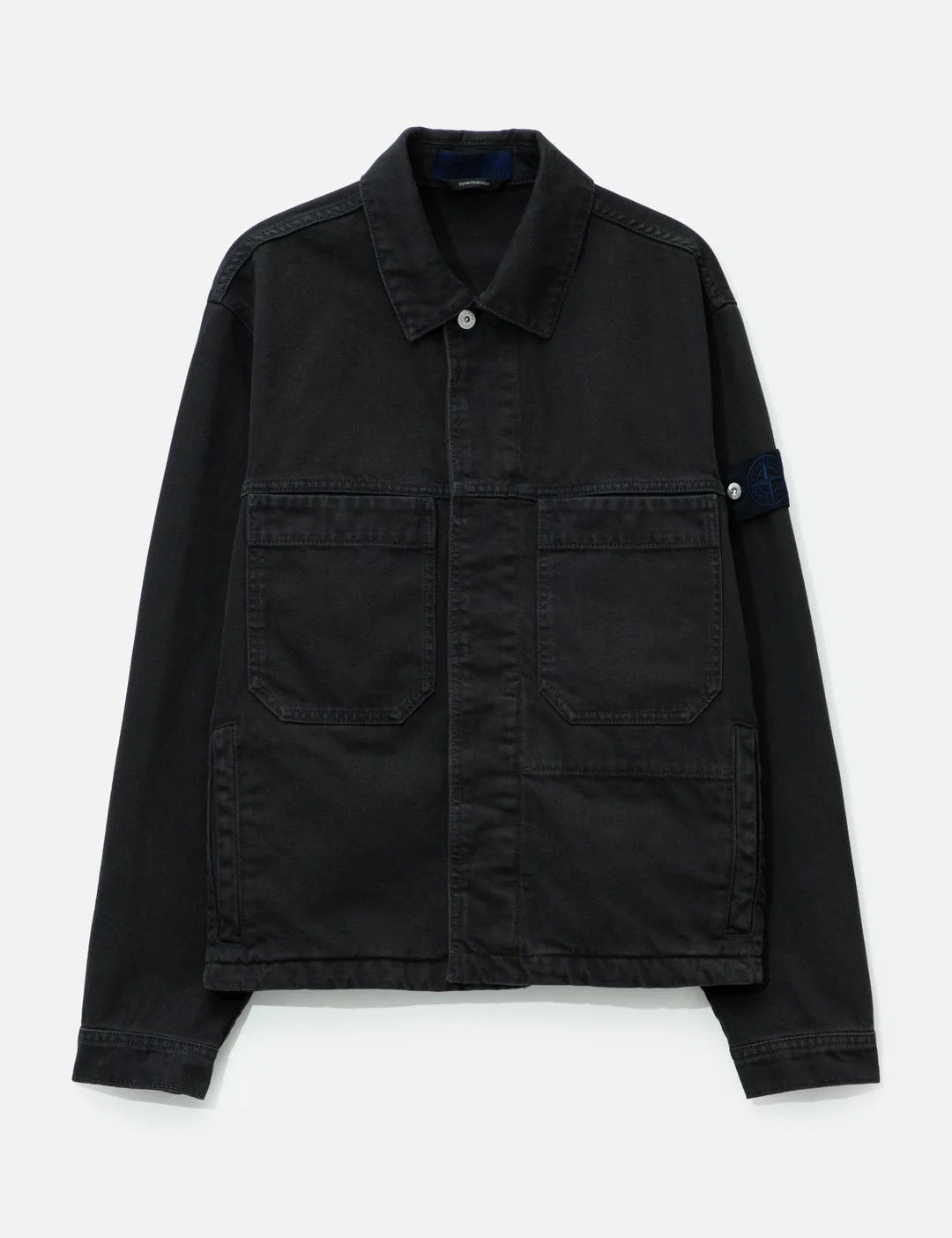 - Stone Island - Light Bull Denim TC Jacket - Regular fit - Made of lightweight 13oz denim - Garment dyed - Anti-drop finish - Hidden button closure with one visible button at collar - Button at cuffs - Stone Island Denim Research badge with metal buttons on left sleeve - Two patch chest pockets with concealed snap - Two side slant pockets - One inner pocket - Color: V0029 - Black - Material: 100% Cotton - See more Denim Jackets, Jackets and Clothing - Model wears size M - Model measures: Height 186cm, Chest 34”/86cm, Waist 28”/71cm, Hip 36”/91cm - Vendor Code: S14 4100006 S0J24