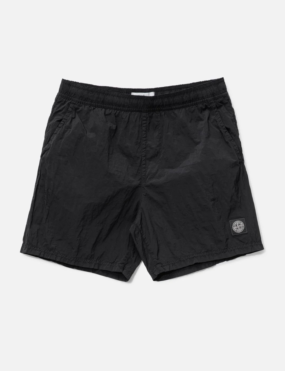 - Stone Island - Nylon Metal In Econyl® Swim Shorts - Made of iridescent Nylon Metal fabric - Use of ECONYL® regenerated yarns - Garment dyed with a double colour recipe - Regular fit - Elastic waistband with drawstring - Slanted hand pockets - One back pocket with zip hidden under fixed flap - Stone Island Compass logo patch on lower left leg - Nylon mesh lining - Color: Black - Material: 100% Polyamide; Lining: 100% Polyamide - See more Shorts and Clothing - Model wears size M - Model measures: Height 187cm, Chest 35.4”/90cm, Waist 27”/69cm, Hip 36”/91cm - Vendor Code: S15 B100004 S0043