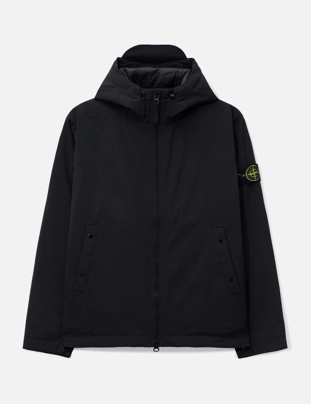 - Stone Island - Soft Shell-R Padded Jacket - Made with 3-ply performance material - 8000 MM water column - Breathable, waterproof and windproof - Flexibility and comfort - 100% recycled polyester stretch canvas outer - E.dye® Waterless Color System™ technology - Padded PrimaLoft® Gold P.U.R.E™ - Highest warmth-to-weight ratio of all synthetic insulations - Treated with an anti-drop agent - Hood with visor and contour drawstring with neck tunnel - Two slanted hand pockets with two snaps and stitched outline - Inner pocket with compass logo embroidery and button - Logo badge on left sleeve - Tightening snap button at cuffs - Drawstring at hem - Hidden two-way zip fastening - Color: Black - Material: 92% Polyester 8% Elastane; Membrane: 100% Polyurethanic Resin; Lining: 100% Polyester; Padding: 100% Polyester - See more Jackets and Clothing - Model wears size M - Model measures: Height 186cm, Chest 34”/86cm, Waist 28”/71cm, Hip 36”/91cm - Vendor Code: S15 4100086 S0A27