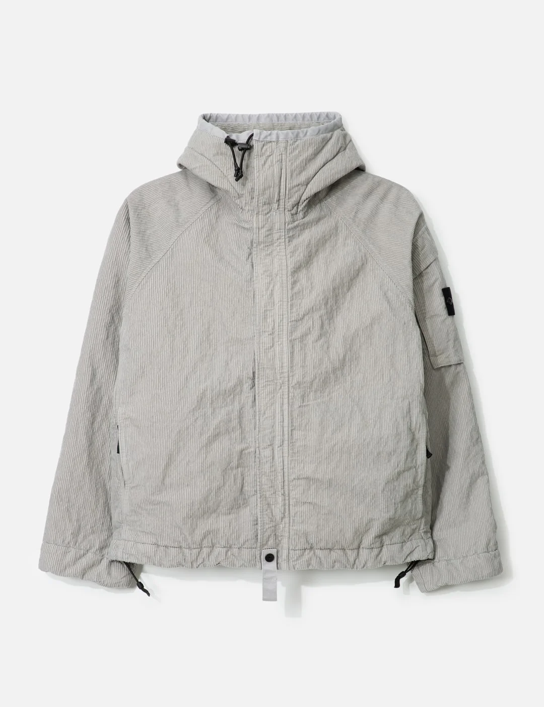 - Stone Island - Wrinkled Corduroy 500-TC Hooded Jacket - Made of cotton and nylon blend fabric - Weaved with monofilament nylon for a wrinkled appearance - Garment dyed - Polyester insulation - Padded hood with drawstring and snaps at the back - Raglan sleeves - Two-way concealed zip fastening - Two side zip pockets - Interior buttoned pocket - Bellows pocket on the left sleeve with Stone Island badge - Elasticated tape cuffs - Color: Pearl Grey - Material: 76% Cotton, 24% Polyamide; Padding: 100% Polyester - See more Jackets and Clothing - Model wears size M - Model measures: Height 186cm, Chest 34”/86cm, Waist 28”/71cm, Hip 36”/91cm - Vendor Code: S15 4100056 S0229