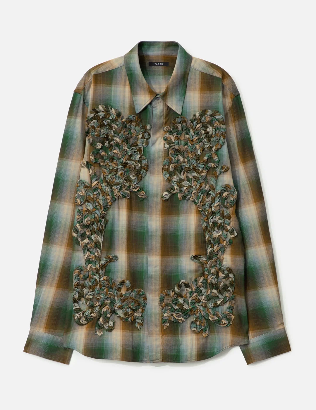 - TAAKK - Check Embroidery Shirt - Relaxed fit - Point collar - Button closure at neckline - Sculpture like embroideries on front - Details with a 1.2cm width cut from the same material - Long sleeve - Cruved hem - Adjustable cuffs with button - Color: Green - Material: 100% Rayon - See more Shirts and Clothing - Model wears size 2 - Model measures: Height 186cm, Chest 34”/86cm, Waist 28”/71cm, Hip 36”/91cm - Vendor Code: TA25AW-SH020