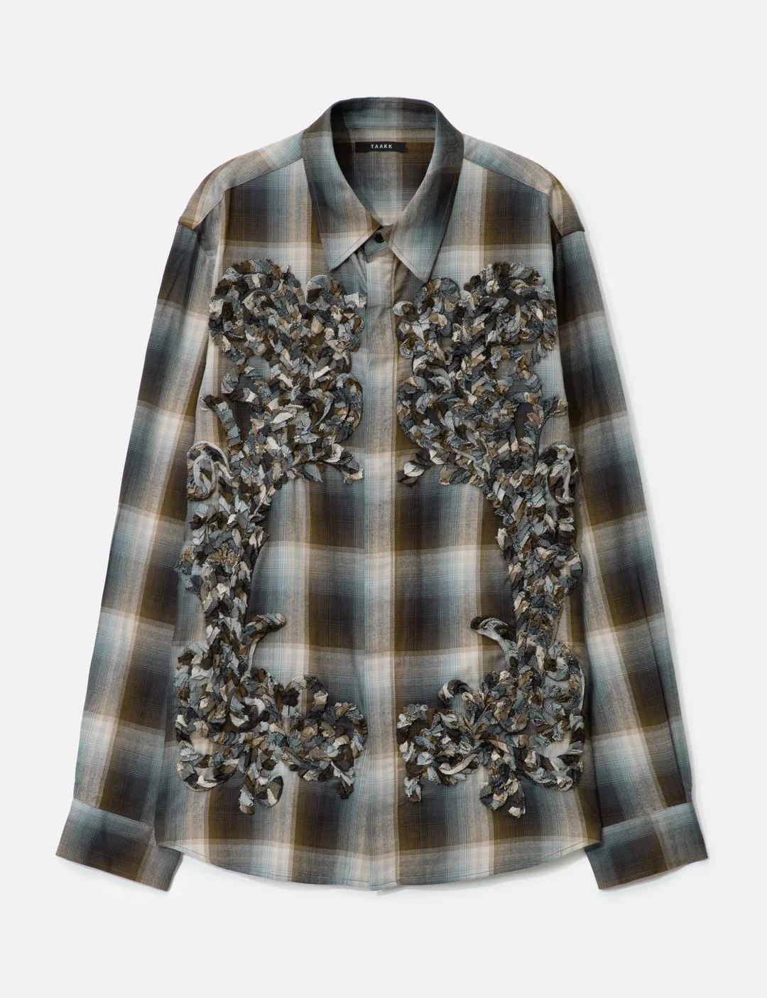 - TAAKK - Check Embroidery Shirt - Relaxed fit - Point collar - Button closure at neckline - Sculpture like embroideries on front - Details with a 1.2cm width cut from the same material - Long sleeve - Cruved hem - Adjustable cuffs with button - Color: Black - Material: 100% Rayon - See more Shirts and Clothing - Model wears size 2 - Model measures: Height 186cm, Chest 34”/86cm, Waist 28”/71cm, Hip 36”/91cm - Vendor Code: TA25AW-SH020
