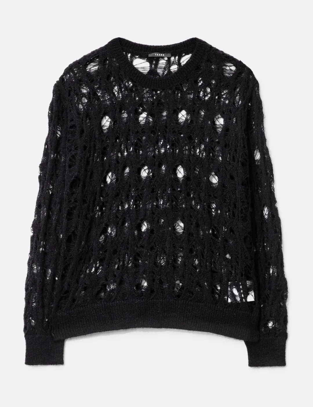 - TAAKK - Lame Mohair Knit - Made of mohair blended yarn - Relaxed fit - Knit with holes for a translucent look - Crewneck - Long sleeve - Ribbed collar, cuffs and hem - Color: Black - Material: 45% Nylon, 40% Acrylic, 10% Wool, 5% Mohair - See more Knitwear and Clothing - Model wears size 2 - Model measures: Height 186cm, Chest 34”/86cm, Waist 28”/71cm, Hip 36”/91cm - Vendor Code: TA25AW-KN035