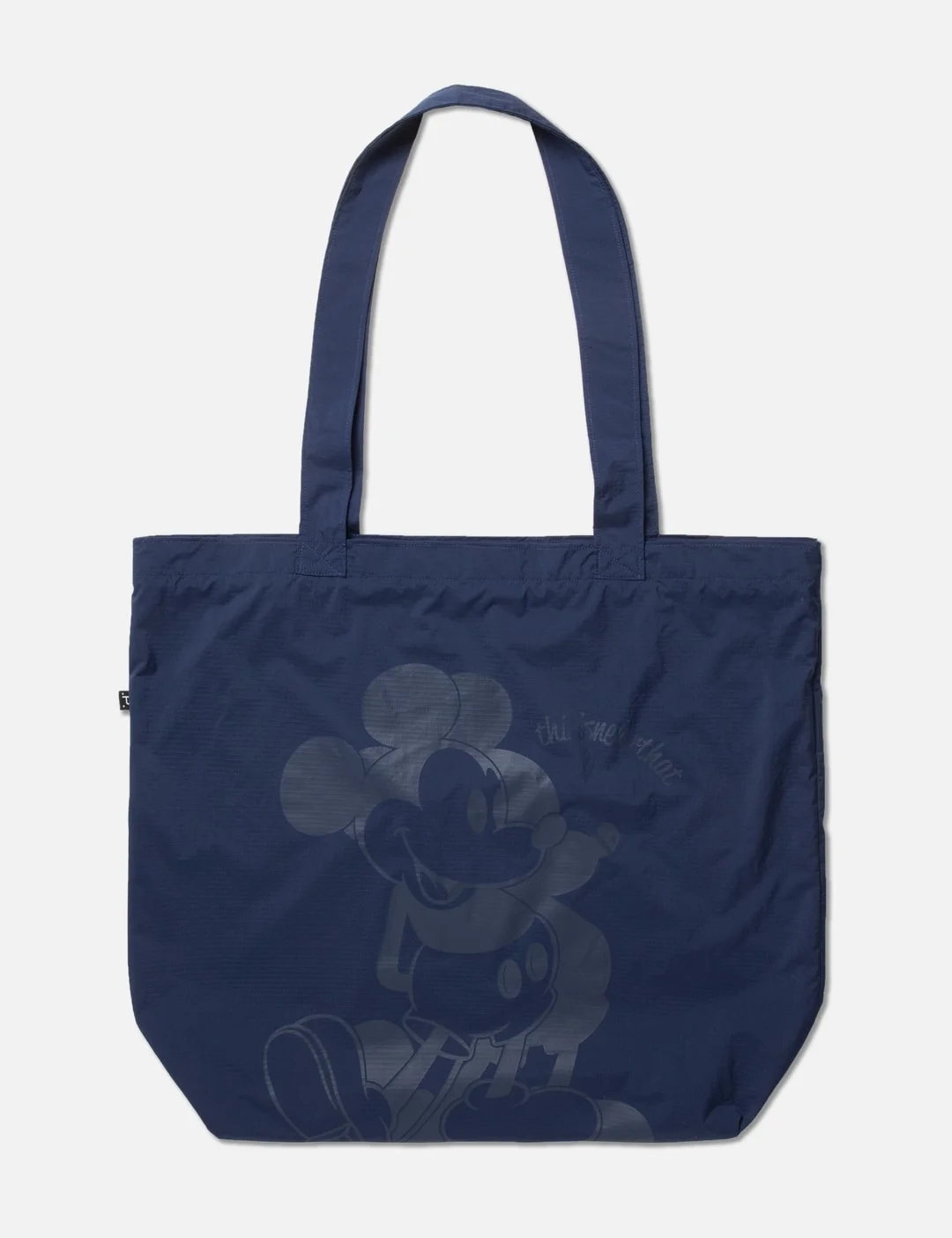 - thisisneverthat® - Mickey PERTEX® EQ Packable Tote - thisisneverthat® x Disney collaborative collection - Lighweight and durable PERTEX® Equilibrium fabric - Co-branding print at both sides - One external packable pocket - Adjustable drawcord at inner compartment - Color: Navy - Material: 100% Navy - See more Tote Bags, Bags and Accessories - Height: 39cm - Width: 46cm - Depth: 10cm - Strap Length: 30cm - Vendor Code: DS251WBATB01