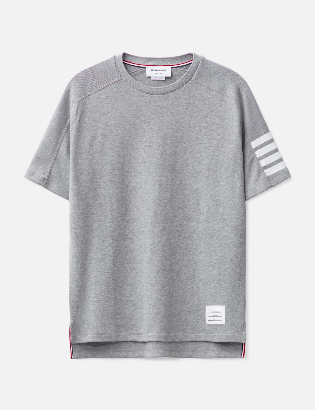 - Thom Browne - Cotton 4-Bar Short Sleeve T-shirt - Crewneck - Signature 4-bar detailing at sleeve - Name tag patch above hem - Signature striped grosgrain loop tab - Straight hem - Color: Light Gray - Material: 100% Cotton - See more SS T-Shirts, T-Shirts and Clothing SIZING - Model wears size 3 - Model measures: Height 188cm, Chest 38”/96cm, Waist 30”/78cm, Hip 37”/94cm