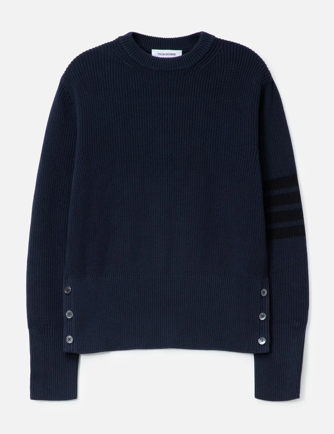 - Thom Browne - Cotton Cardigan Stitch 4-bar Pullover - Classic Oxford cotton shirt - Garment dyed - Crewneck - Buttoned cuffs and side vents with RWB grosgrain trim - 4-bar detailing - Signature striped grosgrain loop tab - Made in Italy - Color: Navy - Material: 100% Cotton - See more Knitwear and Clothing - Vendor Code: MKA580A-Y3065-415