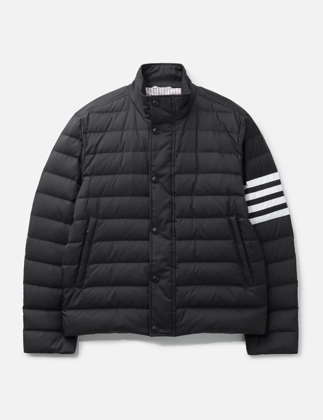 - Thom Browne - Down Filled 4-Bar Jacket - Stand collar - Snap closure with hidden zipper - 4-bar detail on sleeve - Two front zipper pockets - Plain back yoke with locker loop - Signature striped grosgrain loop tab at back collar - Tricolor lining - Two inner zipper pockets - Made in Italy - Color: Black - Material: 81% Polyamide, 19% Polyester; Combo 1: 100% Polyester; Padding: 80% White Goose Down, 20% White Goose Feathers - See more Puffer Jackets, Jackets and Clothing - Model wears size 2 - Model measures: Height 188cm, Chest 38”/96cm, Waist 30”/78cm, Hip 37”/94cm - Vendor Code: MJD136X-F1095-001