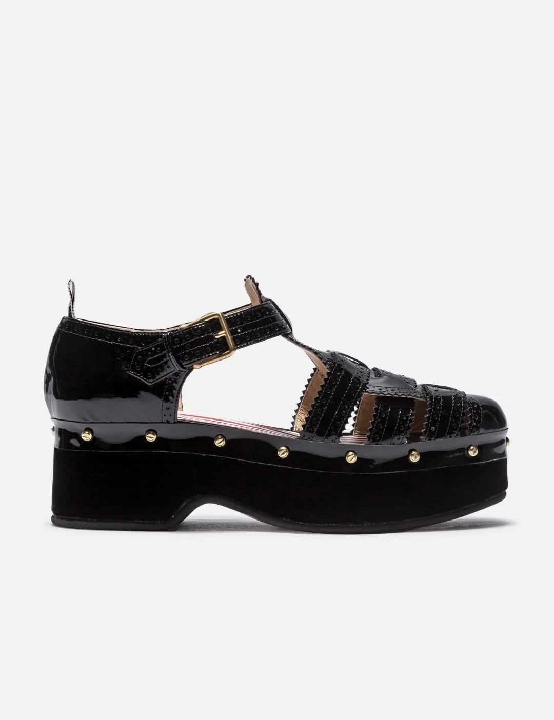 - Thom Browne - Soft Patent Fisherman Clog Sandal - Patent leather strap upper - Cut-out design - Broguing and pinked edges details - Adjustable ankle strap - Brass buckle closure - Signature grosgrain loop tab at the heel - Striped insole - Brass rivets around the midsole - Suede-covered platform wood sole - Color: Black - Material: 100% Calf Patent Leather - See more Sandals and Shoes