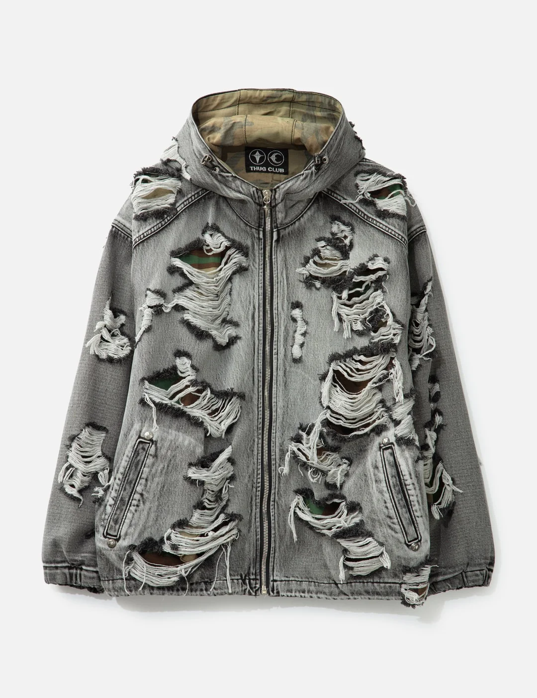 - THUG CLUB - Hell Denim Camo Hooded Zip-up - Washed cotton denim exterior - Distressed details throughout - Fixed hood - Front YKK zip closure - Two side slip pockets - Elasticated cuffs and hem - Branded 'T' symbol top stitching on back panel - Camouflage pattern lining - Color: Black - Material: 100% Cotton; Lining: 80% Polyester, 20% Cotton - See more Jackets and Clothing - Model wears size 2 - Model measures: Height 186cm, Chest 34”/86cm, Waist 28”/71cm, Hip 36”/91cm - Vendor Code: TC25JK2302