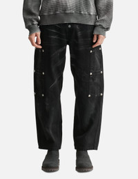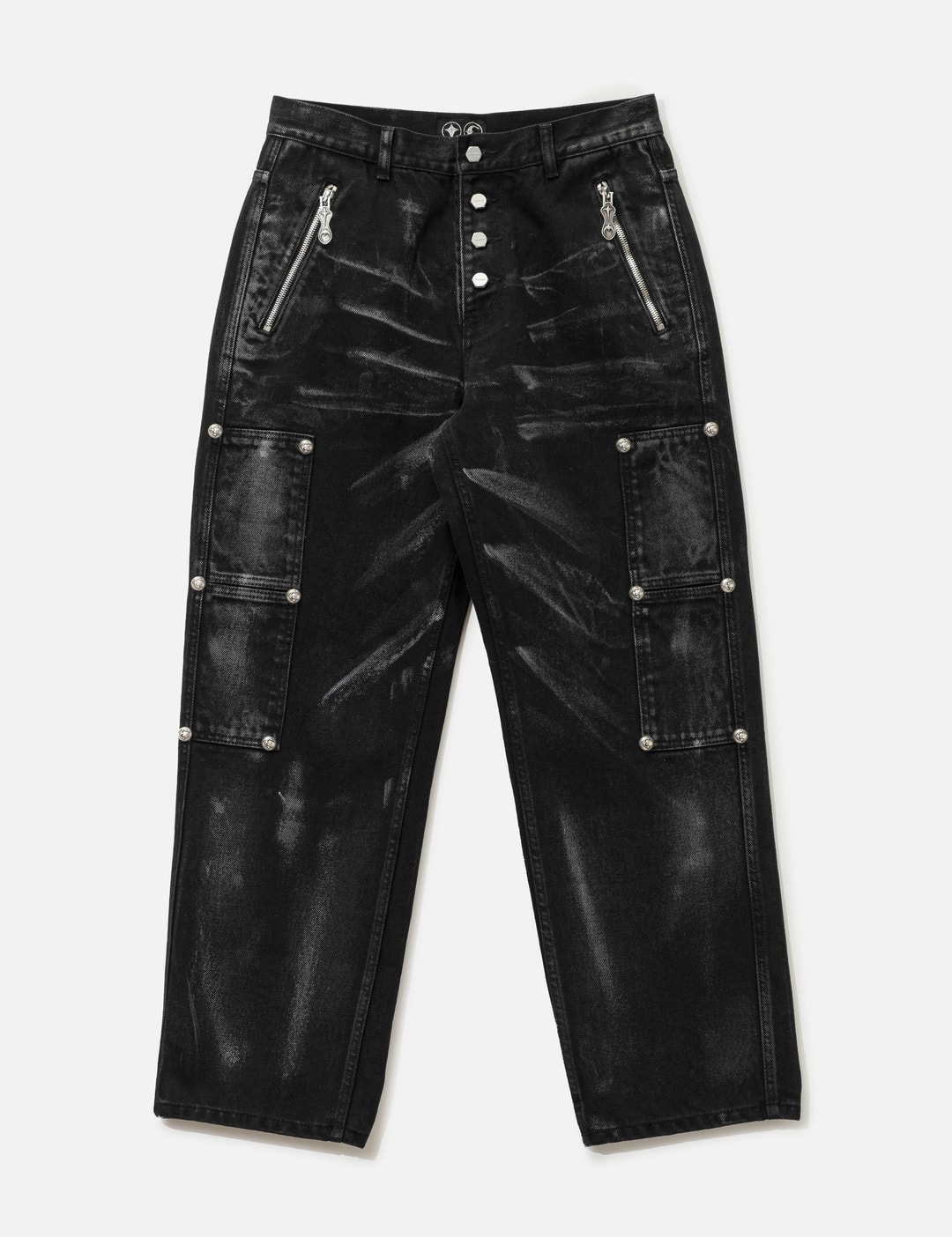 - THUG CLUB - Leave a Trace Denim Pants - Rigid cotton denim fabric - Button fly - TC metal hardware details at leg - Two front pockets; two rear pockets - Two small pockets at leg - Painted details - Color: Black - Country Of Origin: KR - Material: 100% Cotton - See more Jeans and Clothing SIZING - Model wears size 2 - Model measures: Height 186cm, Chest 34”/86cm, Waist 28”/71cm, Hip 36”/91cm