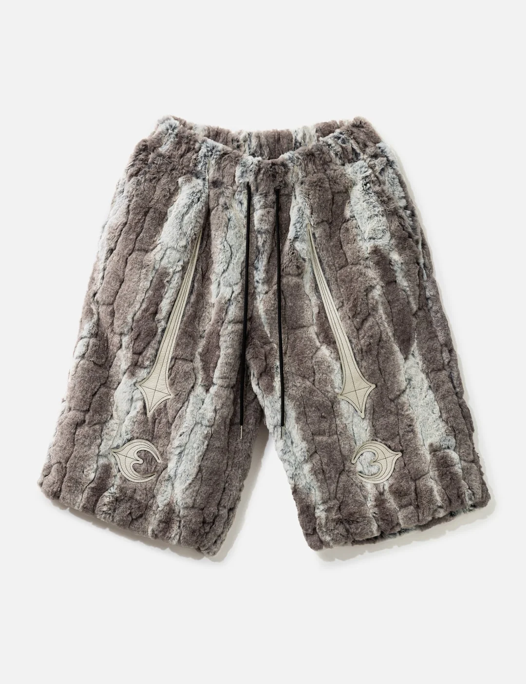- THUG CLUB - TC Bone Fur Shorts - Soft furry polyester exterior - Oversized fit - Below knee length - Two-tone striped pattern throughout - Elasticated waistband with drawcord - Embroidered branded leather patch on front - Two side slip pockets - Two rear patch pockets - Color: Ivory - Material: 100% Polyester; Patch: 100% Cowhide - See more Jeans and Clothing - Model wears size 2 - Model measures: Height 186cm, Chest 34”/86cm, Waist 28”/71cm, Hip 36”/91cm - Vendor Code: TC25PT2401