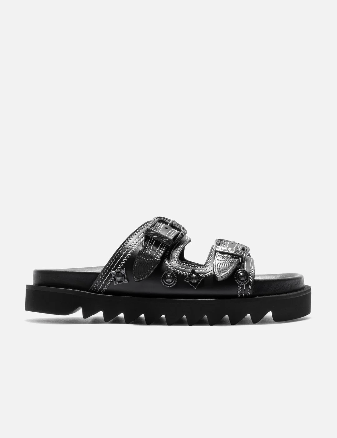 - Toga Pulla - Black Buckle Sandals - Sport sandals with tonal metal buckle - Cowhide upper - Adjuster on the front strap - Contrasting stitches - Round toe - Slips on - EVA sole - Shark sole - Color: Black - Material: Cowhide; EVA; Alloy - See more Sandals and Shoes - Vendor Code: AJ1432 - BLACK LEATHER