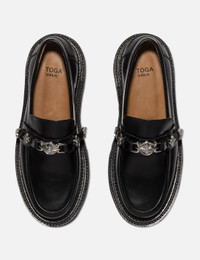 - Toga Virilis - Classic Bumper Loafers - Polido leather upper - Glossy and smooth leather surface - Slip-on - Rounded toe - Silver-tone hardware detail on strap - Metal plate details on heel - Leather lining - Chunky leather coated outsole - Color: Black - Material: Leather - See more Casual Shoes and Shoes