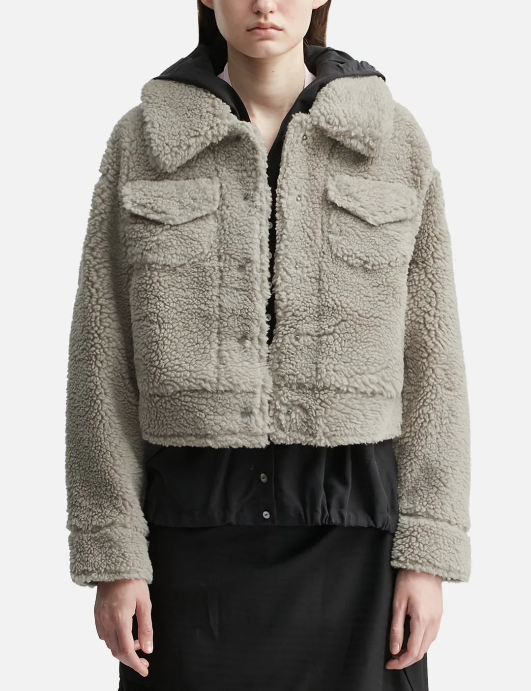 - UGG - Frankie Short Trucker Jacket - Relaxed fit - Slightly cropped length - Made of recycled plush fleece - Center front placket with The UGG® Logo snaps - Chest pockets with flap and hidden snap closure - Side welt pockets - Soft fleece hand warmer pocket linings - Metal snap closures at cuff - The UGG® Logo label - Jacquard lining with The Sun Logo Shape - Color: Cobble Grey - Material: 100% Polyester; Lining: 100% Nylon - See more Shearling Jackets, Jackets and Clothing - Model wears size S - Model measures: Height 180cm, Chest 28.3’’/72cm, Waist 22’’/56cm, Hip 35’’/89cm - Vendor Code: 2UG1171459CBBLG