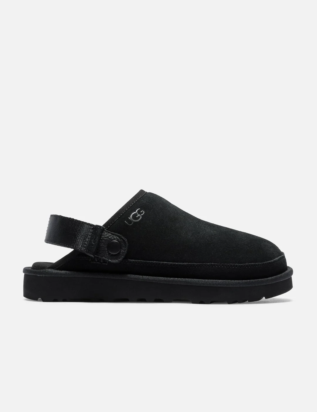 - UGG - Goldencoast Clog Ii - Suede upper - Microfiber binding - Metal hardware - Heat-embossed logo - Adjustable heel strap, hook-and-loop closure - Microfiber sockliner - Recycled polyester textile lining - Foam footbed - Sugarcane EVA outsole - Color: Black - Material: Suede; Lining: 100% Recycled Polyester; EVA - See more Casual Shoes and Shoes - Vendor Code: 1UG1166915BLK