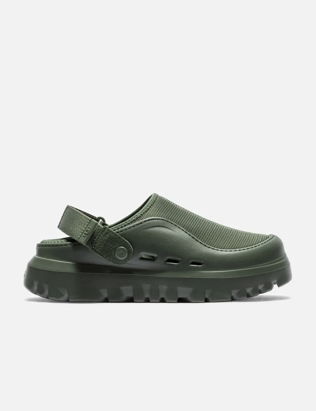 - UGG - PeakMod - Mesh upper made with - Removable heel strap - Recycled textile sockliner - Logo screen printed on footbed - Logo pull tab - Molded revet with the UGG® logo - Poured PU footbed with at least 50% bio-based content - Ultra-light sugarcane EVA outsole - Flocked outsole - Color: Wooland Green - Material: Mesh Upper: 80% Recycled Polyester, 20% Polyester; Lining: 100% Recycled Polyester; EVA - See more Casual Shoes and Shoes - Vendor Code: 1UG1166912WLN