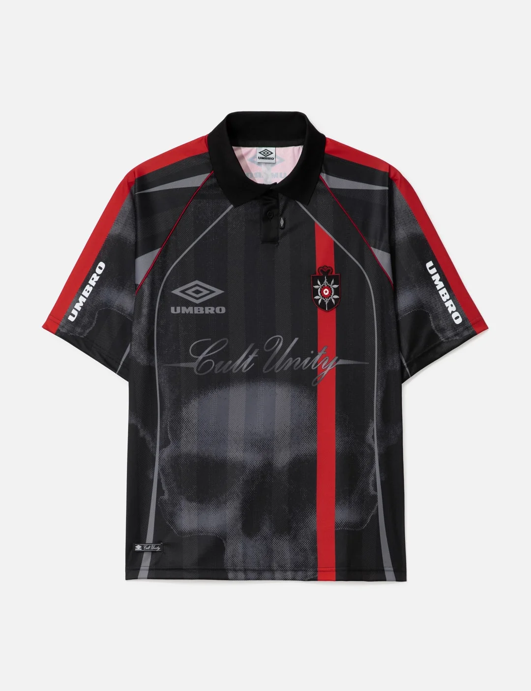 - Umbro - Umbro x Slam Jam 01 03 Polo - Umbro x Slam Jam collaboration - Lightweight polyester exterior - Loose fit - Co-branded graphic printed - Classic collar - Buttoned placket with logo label - Raglan shoulders - Short sleeves - Rose crest embroidery on the chest - Straight hem - Color: Black / Red - Material: 100% Polyester - See more T-Shirts and Clothing - Model wears size M - Model measures: Height 186cm, Chest 34”/86cm, Waist 28”/71cm, Hip 36”/91cm - Vendor Code: UBMW0402FA251