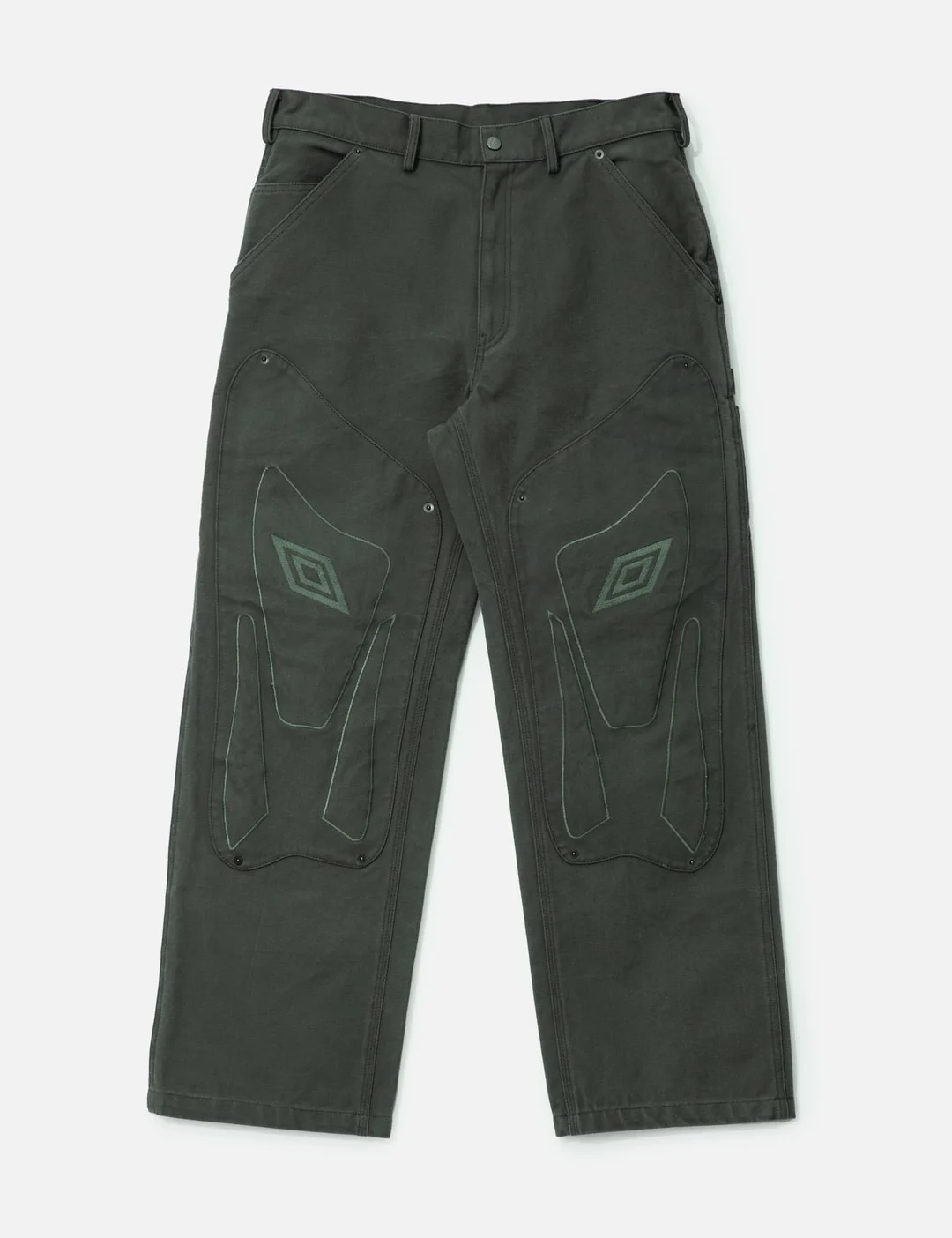 - Umbro - Umbro x Slam Jam Shinguard Canvas Pants - Umbro x Slam Jam collaboration - Made of heavyweight cotton canvas - Loose fit - Zip-fly - Belt loops - 5-pocket design - Straight legs - Reinforced patch on knees - Logo embroidery - Hammer loop - Side utility pockets - Color: Dark Olive - Material: 100% Cotton - See more Jeans and Clothing - Model wears size M - Model measures: Height 186cm, Chest 34”/86cm, Waist 28”/71cm, Hip 36”/91cm - Vendor Code: UBMW0338FA213