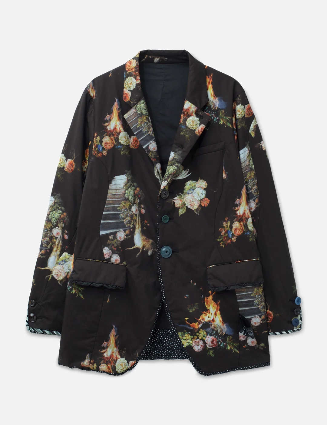 - Undercover - UNDERCOVER × Emma Bennett Floral Print Jacket - UNDERCOVER × Emma Bennett collaboration - Made of cotton and polyester - Padded - Lapel collar - Buttoned closure - Allover floral print - One chest pocket - Two front flap and patch pockets - Brand label below front pocket and back seam - Cotton and silk lining with a blown-out design - Two inner buttoned pockets - Made in Japan - Color: Black Base - Material: 100% Cotton; Filling: 100% Polyester; Lining: 70% Cotton, 30% Silk - See more Jackets and Clothing - Model wears size 3 - Model measures: Height 187cm, Chest 35.4”/90cm, Waist 27”/69cm, Hip 36”/91cm - Vendor Code: UC1F4101-1
