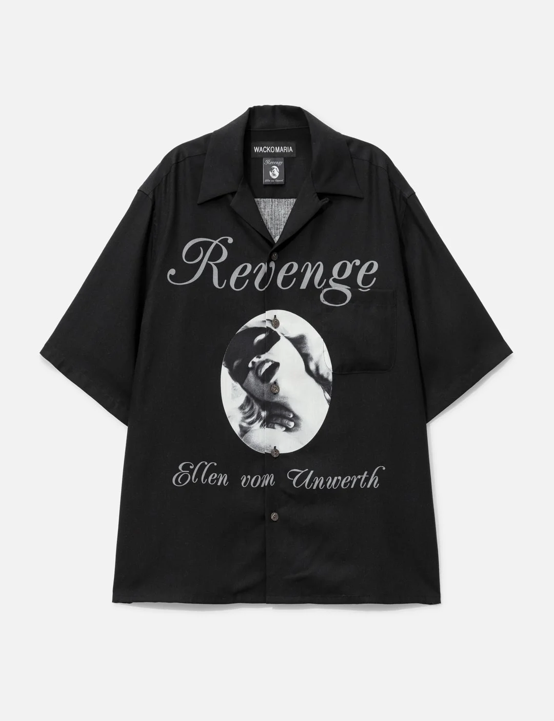 - Wacko Maria - Ellen Von Unwerth Hawaiian Shirt (Type-1) - Wacko Maria x Ellen Von Unwerth collaborative collection - Soft Tencel fabric - Camp collar - Button closure - Chest pocket - Graphic print of Ellen Von Unwerth artwork at front - Arched logo print at rear - Straight hem - Color: Black - Material: 100% Tencel - See more Shirts and Clothing - Model wears size M - Model measures: Height 187cm, Chest 34”/84cm, Waist 26”/67cm, Hip 36”/88cm - Vendor Code: EVU-WM-HI01
