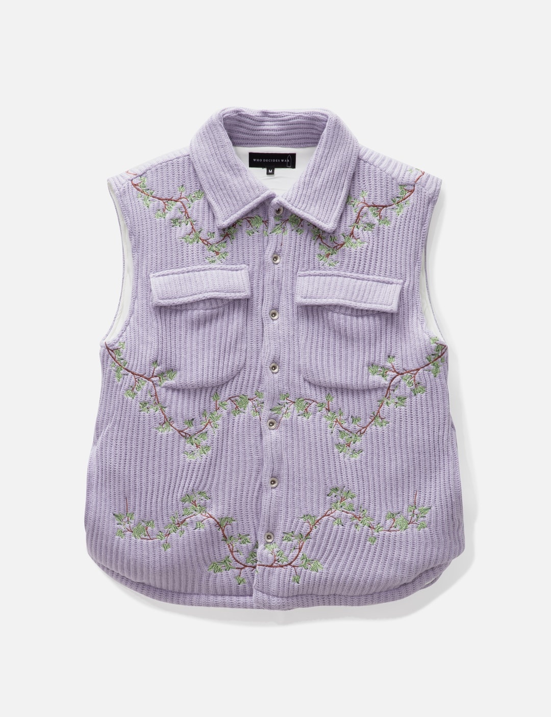 - Who Decides War - Vine Vest - Knitted wool blend - Button closure - Standard collar - All-over embroidery details - Two chest flap pockets - Two side pockets - Fully lined - Wavy hem - Color: Lavender - Material: 40% Acrylic, 30% Wool, 30% Nylon - See more Knitwear and Clothing SIZING - Model wears size M - Model measures: Height 188cm, Chest 38”/96cm, Waist 29”/74cm, Hip 37”/94cm