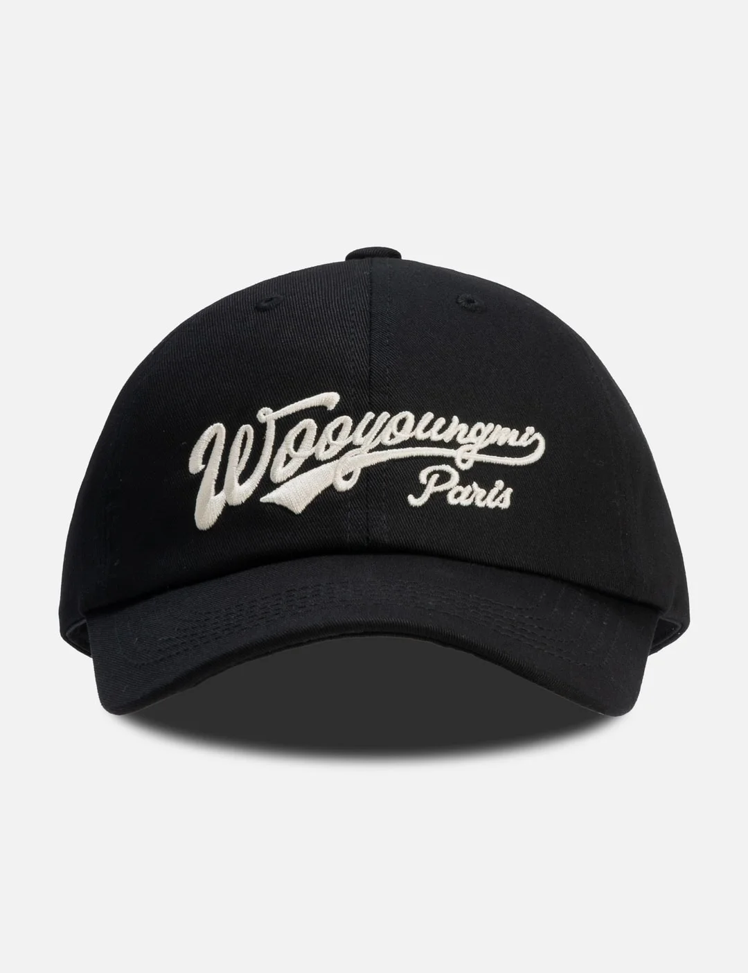 - Wooyoungmi - Script Logo Cap - Made of cotton - Six-panel construction - Curved brim with pipping detail - Embroidered script logo on the front - Embroidered logo at the back - Adjustable buckle strap - Made in Korea - Color: 661B - Black - Material: 100% Cotton - See more Caps, Hats and Accessories - Brim Width: 7cm - Crown Height: 12cm - Circumference: 60cm - Vendor Code: W261CA57