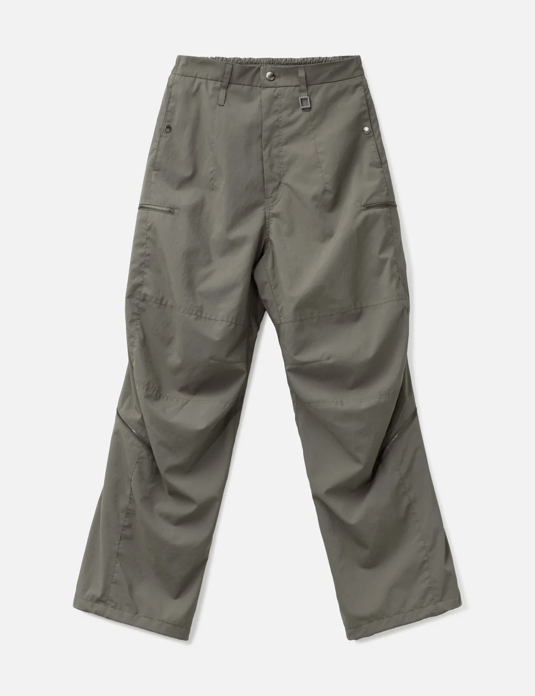- Wooyoungmi - Zip Twist Pants - Made of polyester - Zip fly - Elasticated waistband - Metal brand logo at belt loop - Two front snap button pocket - Four side zipper pockets - Hem with bungee cord - Mesh lining - Made in Korea - Color: 919G - Grey - Material: 100% Polyester - See more Pants and Clothing - Model wears size 48 - Model measures: Height 186cm, Chest 34”/86cm, Waist 28”/71cm, Hip 36”/91cm - Vendor Code: W261PT15