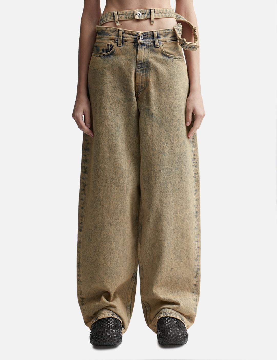 - Y/PROJECT - Multi Waistband Jeans - Multi waistband details - Wide leg - Zip fly - 5 pocket style - Color: Dusty Beige - Country Of Origin: FR - Material: 100% Cotton - See more Jeans and Clothing SIZING - Model wears size S - Model measures: Height 177cm, Chest 32"/81cm, Waist 23.5"/59.7cm, Hip 33’’/83.8cm