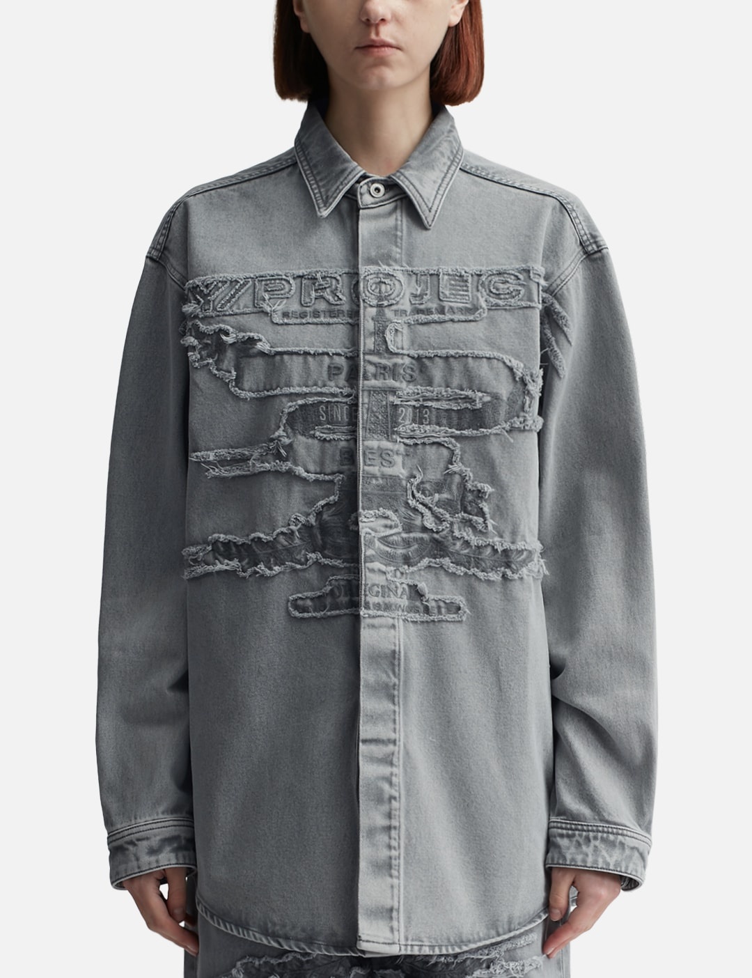 - Y/PROJECT - Paris' Best Patch Denim Shirt - Denim button-down shirt - Oversized fit - Point collar - Concealed button closure - "Paris' Best" patch stitched across the chest - Long sleeves - Button cuffs - Logo patch at the back neck - Color: Grey - Country Of Origin: FR - Material: 100% Cotton - See more Shirts and Clothing SIZING Men - Model wears size M - Model measures: Height 186cm, Chest 35”/89cm, Waist 30.5”/78cm, Hip 35.5”/91cm Women - Model wears size S - Model measures: Height 177cm, Chest 32”/81cm, Waist 23.5”/59.7cm, Hip 33’’/83.8cm