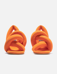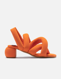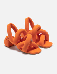 - Yume Yume - Sausage Heel - Slip-on design - Open square toe - Padded suede straps - Woven branding label on the sole - Puffy heel - Color: Orange - Material: Suede, Rubber - See more Heels and Shoes